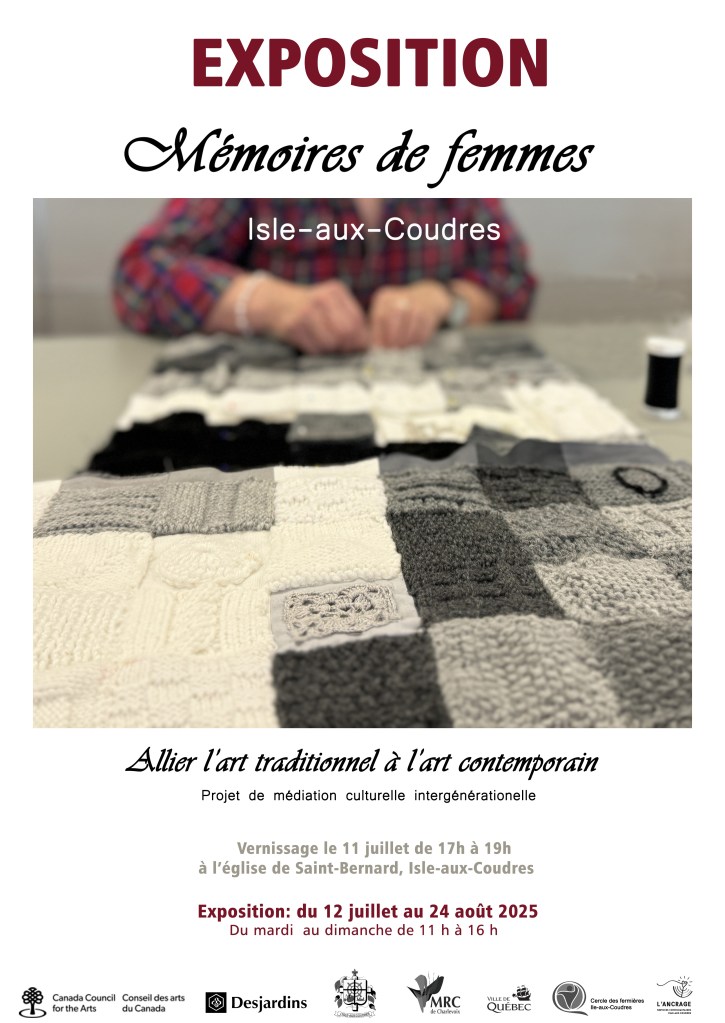 Mémoires de Femmes est un projet artistique intergénérationnel qui propose une rencontre singulière entre tradition et contemporanéité. Portée par un profond désir de transmission et de reconnaissance, cette initiative met en lumière des femmes âgées de 60 à 90 ans de l’Isle-aux-Coudres, gardiennes de savoir-faire ancestraux. À travers une démarche créative, elles ont transformé, revisité et réinventé leurs gestes d’autrefois pour les inscrire dans une expression artistique actuelle. Ce dialogue entre pratiques habituellement dissociées — l’artisanat, enraciné dans la technique et la fonction, et l’art visuel, centré sur l’expérimentation et la réflexion — ouvre un espace inédit de création. Sous l’impulsion de l’artiste Yolande Harvey, les participantes ont été invitées à s’aventurer au-delà des cadres connus, à questionner leurs habitudes et à s’approprier une nouvelle liberté. Cette rencontre entre deux mondes a non seulement élargi leur champ d’exploration, mais a aussi légitimé leur contribution au langage artistique.