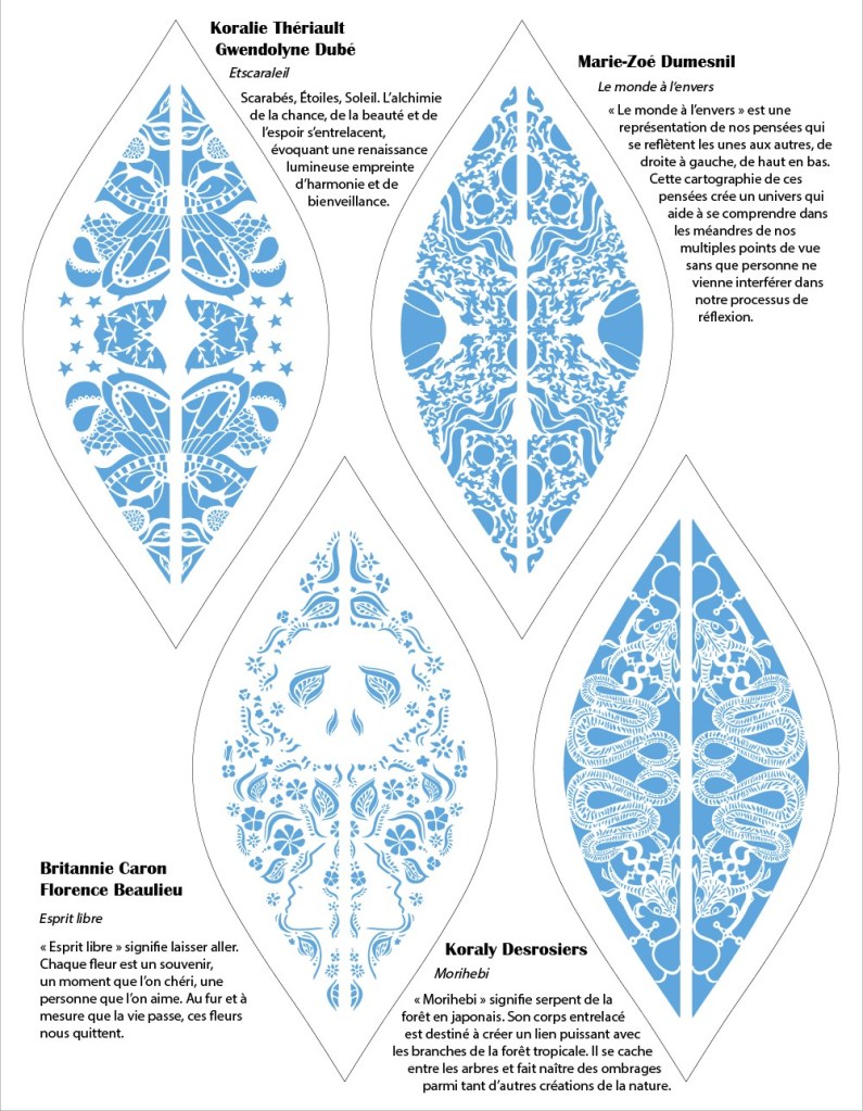 Nom des artistes participants: Koralie Thériault / Gwendolyne Dubé / Koraly Desrosier / Océanne Millette / MaÏna Dubois / Marie-Zoé Dumesnil / Félix Rouisse / Mathilde Brisette / Anaïs Mongrain / Britannie Caron / Florence Beaulieu Rochette.