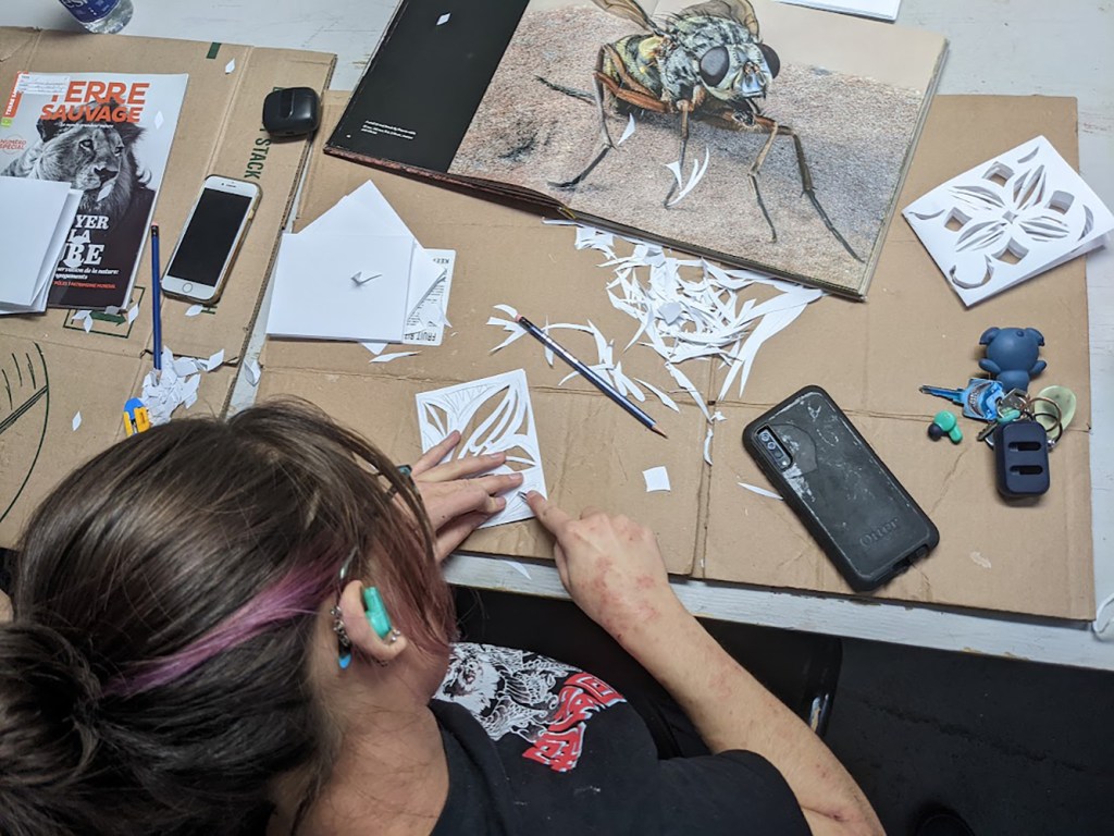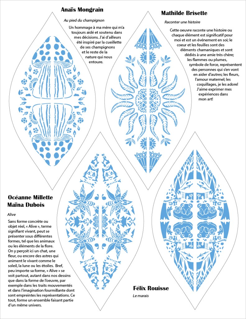 En suivant la ligne directrice de la feuille, les sujets liés à la vie et à la nature ont stimulé l’imagination des participants dans leur exploration artistique. Les propositions ont été remarquablement variées, reflétant ainsi l’univers et les préoccupations individuelles de chacun. Malgré le caractère collaboratif de cette création, l’artiste insiste sur le fait que chaque participant puisse identifier et valoriser sa contribution au projet. En effet, chaque découpe présente sur les feuilles résultant du travail d’une seule personne (ou d’une équipe de deux).