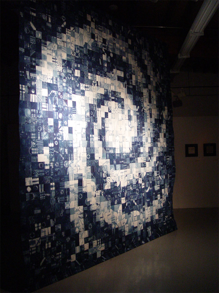 Entropie divine 2007, Tissus teint à l’indigo, 365 x 365 cm Différents procédés de réserve pour la teinture Coton teint à l’indigo Pièces de tissus de 8 x 8cm teints à l’indigo