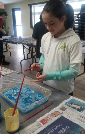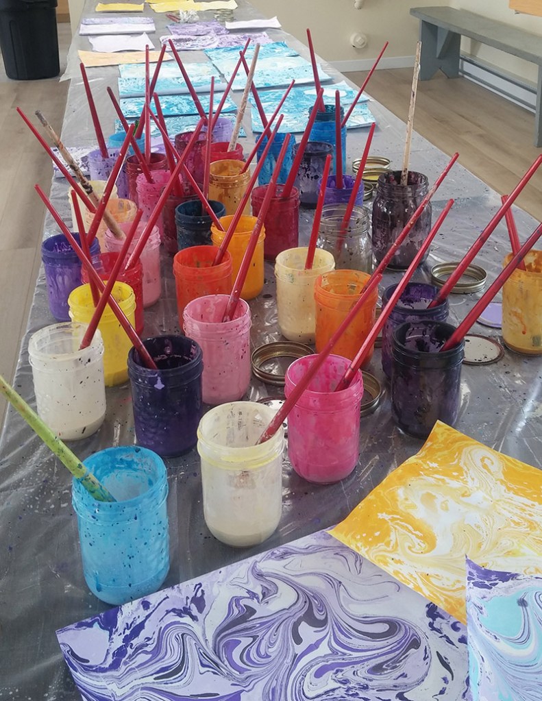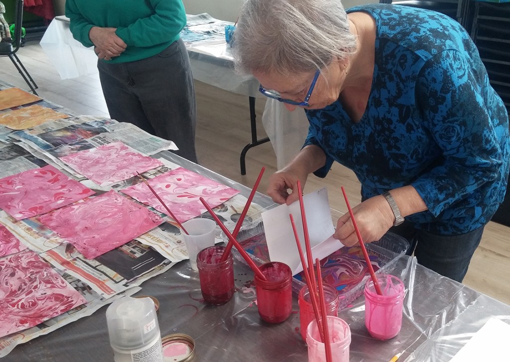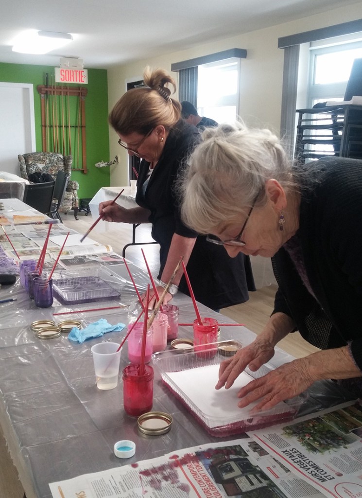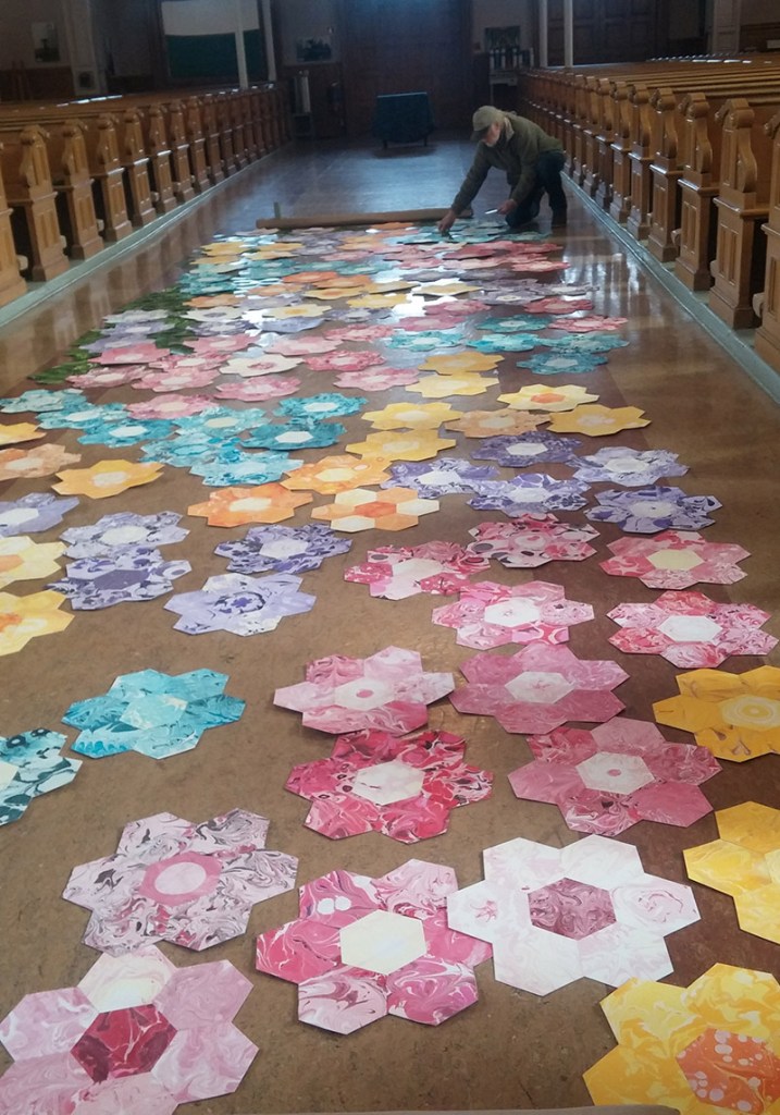 FLEURS D’IMPRESSION, une œuvre de 9 pieds de haut X 30 pieds de large représentant un jardin de fleurs réalisée par 60 personnes de Saint-Cuthbert de 12 à 80 ans. L’œuvre présentée est une courtepointe que les participants ont imprimés avec une technique de transfert d’image par l’eau. Celle-ci consiste à faire flotter sur l’eau de la peinture acrylique pour ensuite créer des motifs à l’aide d’un bâtonnet. On dépose un papier sur l’eau et l’image est imprimée tel que réalisée.