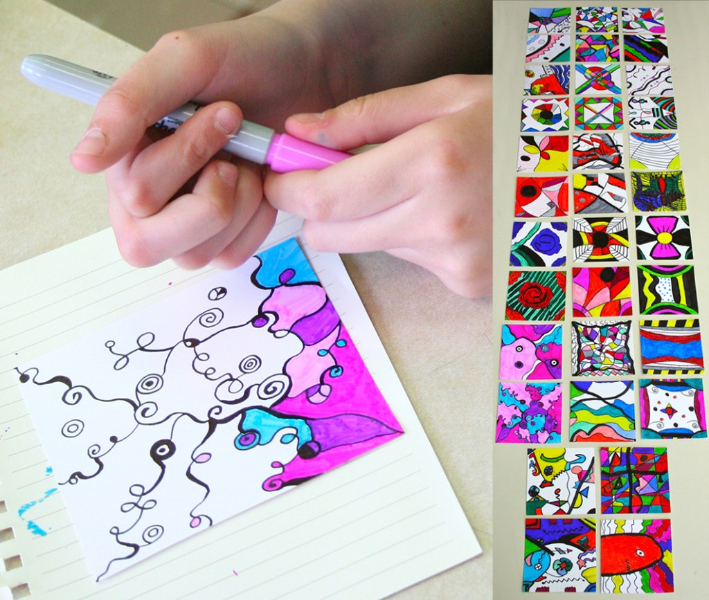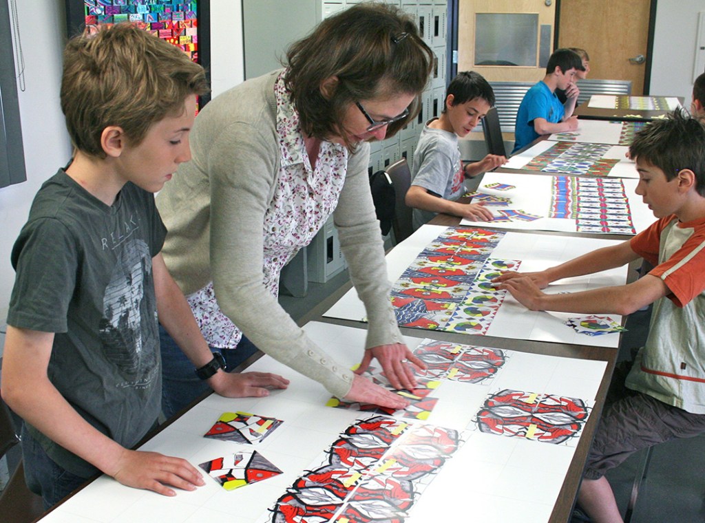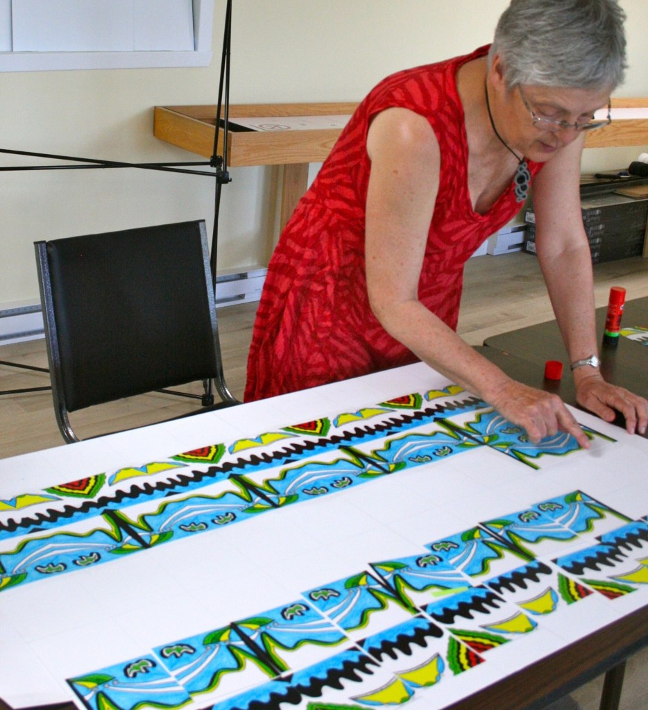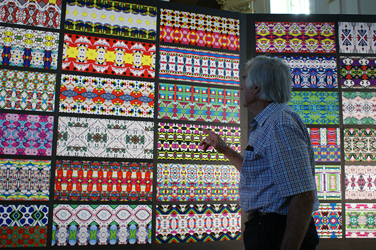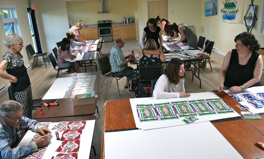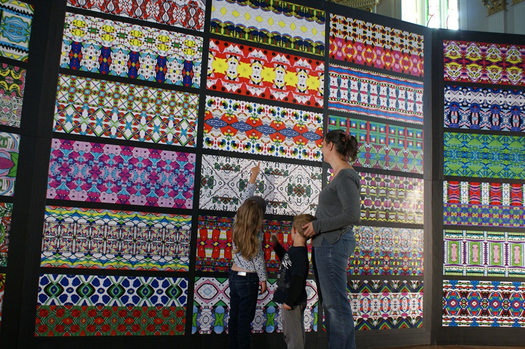 TRANSLATION-RÉFLEXION est une œuvre d’art collective réalisée avec la collaboration de 54 personnes de Saint-Cuthbert âgées de 12 à 84 ans. Chaque participant a réalisé 2 dessins de 10 x 10 cm qui ont été numérisés pour y opérer une symétrie et finalement imprimés en plusieurs exemplaires. L’objectif était de jouer avec les dessins selon un principe de symétrie, de translation et de répétition et découvrir les multiples façons de les disposer pour explorer des configurations toutes autant différentes les unes que les autres et ainsi faire des découvertes étonnantes.