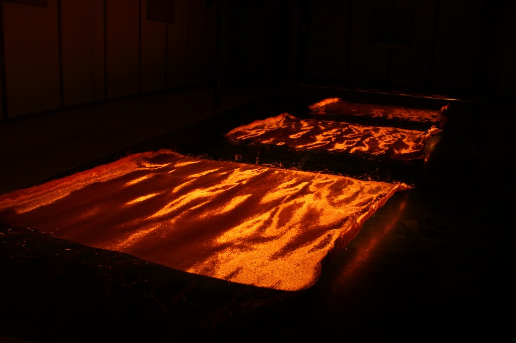 Toutefois, cette approche conceptuel que j’avais adopté au départ a vite fait place à des considérations formelles. En effet, en voyant le résultat du premier tissage réalisé, je me suis orientée davantage vers une recherche esthétique en lien avec la lumière réfléchi et sur un travail sériel basé sur la reproduction d’un procédé. En effet, si je reprenais les même paramètres de départ pour chacun des tissages, c’est à dire, la même grosseur de fil, la même espacement du fil de trame et la même dimension de cadre, est-ce que la différence serait appréciable?